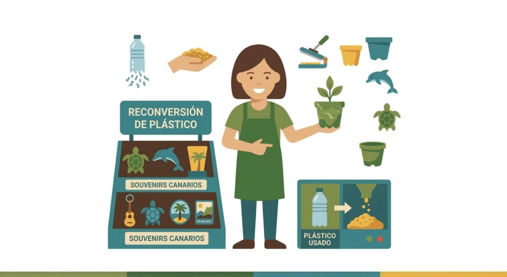 La segunda: convertir el plástico reciclado en materia prima para una industria de producto local. Canarias recibe cada año cerca de 18 millones de turistas. Una parte de ellos compra recuerdos — y hoy esos recuerdos llegan en contenedores desde el otro lado del mundo. Bijuterii și accesorii, ghivece decorative, accesorii de plajă, jucării, mobilier urban, dale, borduri, paleți, tuburi de irigație: productos fabricados en las islas, con plástico recuperado de las islas, con diseño canario. Un mercado real, con volumen real, que hoy no existe y podría existir — y que además reduciría lo que importamos.